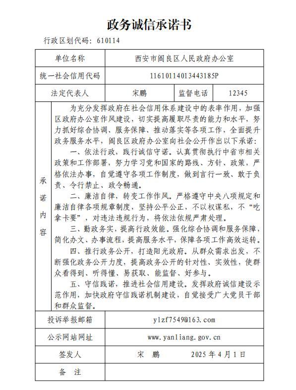 閻良區(qū)人民政府辦公室政務(wù)誠(chéng)信承諾書