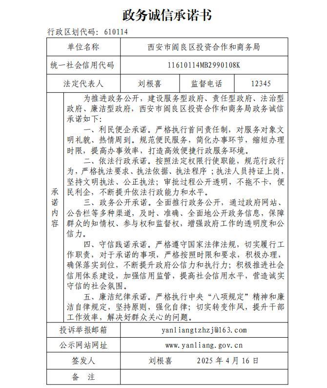 閻良區(qū)投資合作和商務(wù)局政務(wù)誠信承諾書