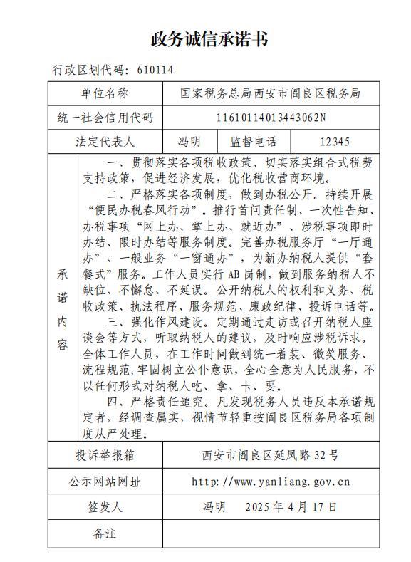 國家稅務總局西安市閻良區稅務局政務誠信承諾書