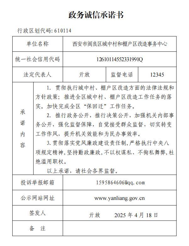 閻良區城中村和棚戶區改造事務中心政務誠信承諾書