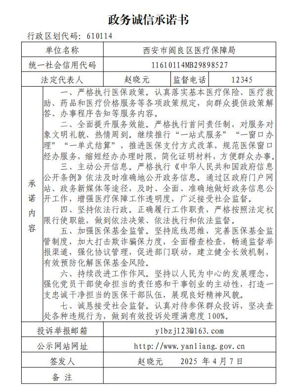 閻良區醫療保障局政務誠信承諾書