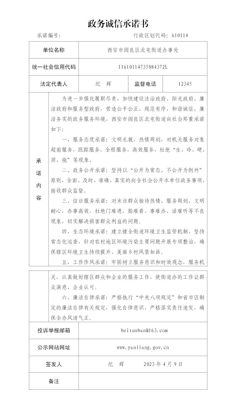 西安市閻良區(qū)北屯街道辦事處政務(wù)誠信承諾書