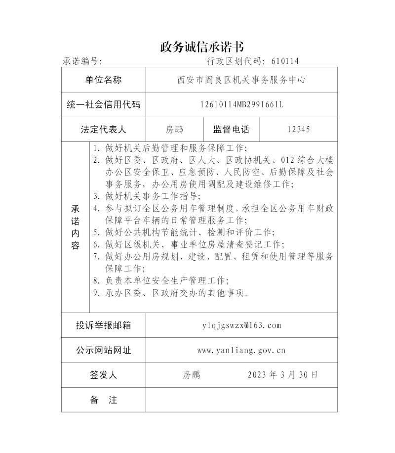 西安市閻良區機關事務服務中心政務誠信承諾書