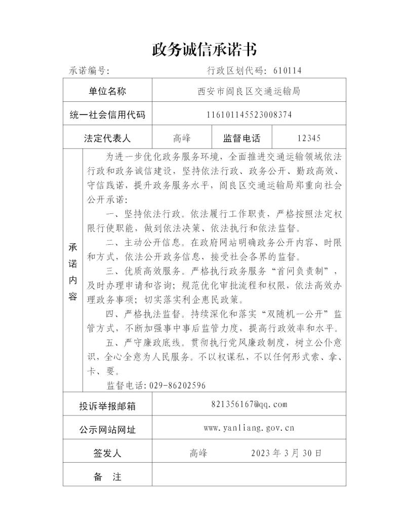 西安市閻良區交通運輸局政務誠信承諾書