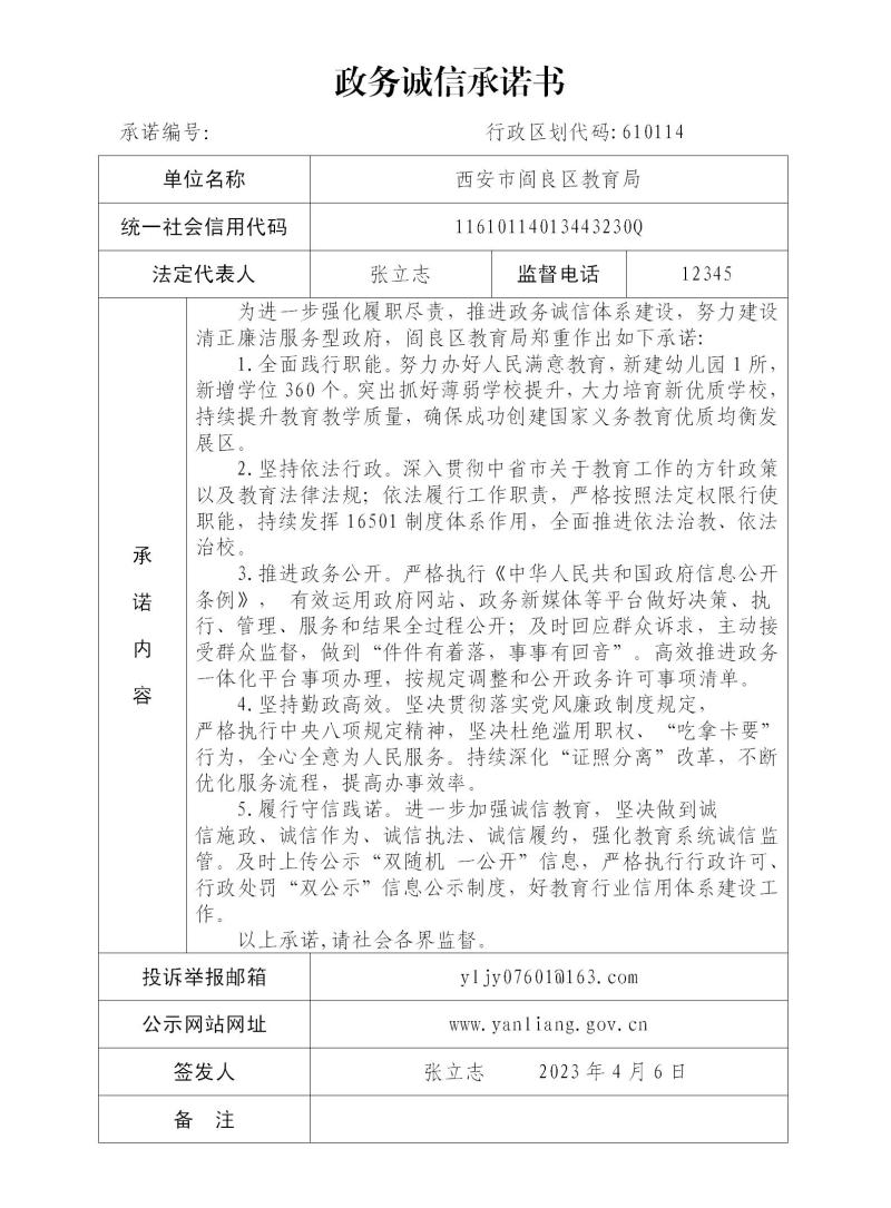 西安市閻良區(qū)教育局政務(wù)誠(chéng)信承諾書(shū)
