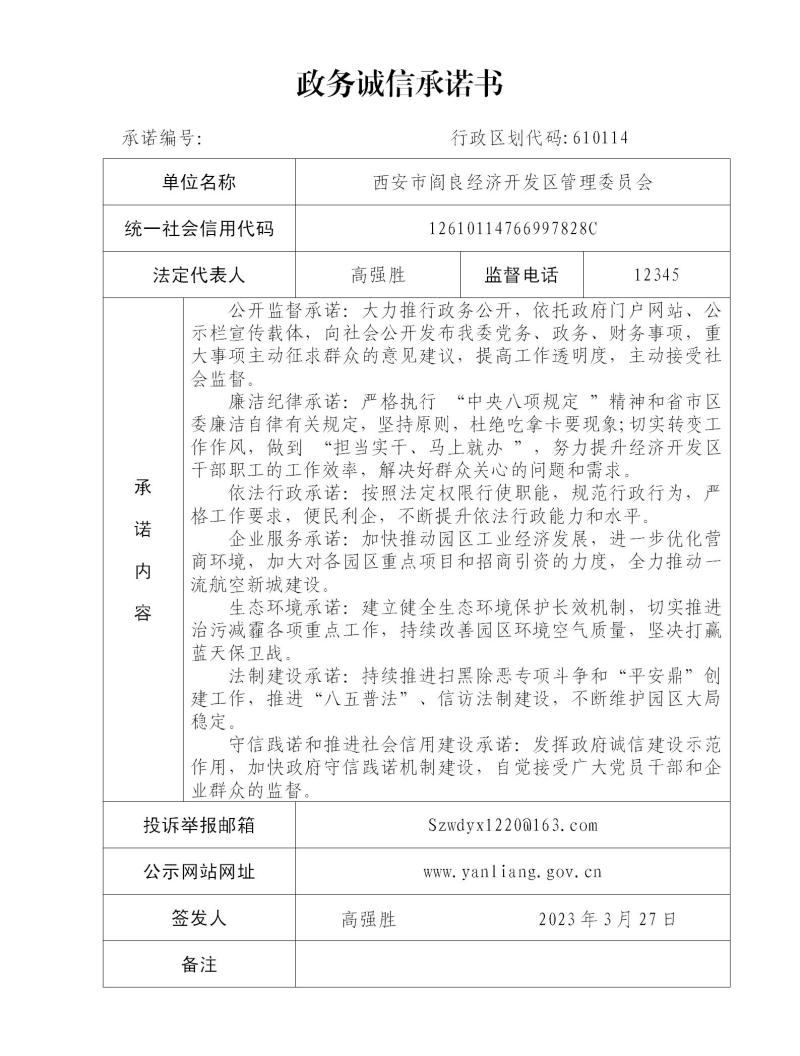 西安市閻良經濟開發區管理委員會政務誠信承諾書