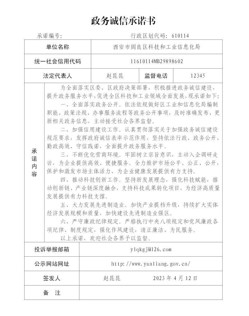 西安市閻良區(qū)科技和工業(yè)信息化局政務(wù)誠(chéng)信承諾書(shū)