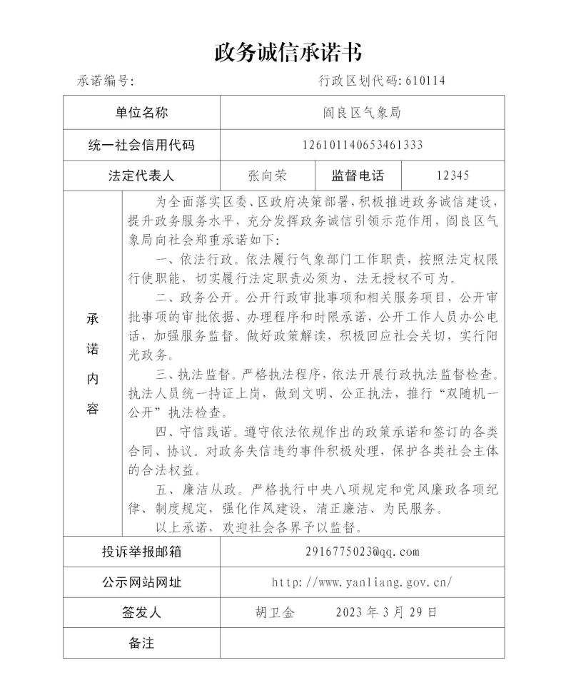 西安市閻良區(qū)氣象局政務(wù)誠(chéng)信承諾書