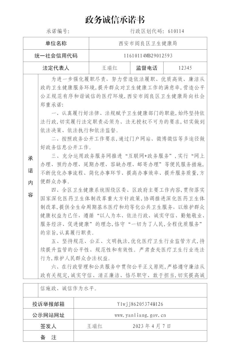 西安市閻良區(qū)衛(wèi)生健康局政務誠信承諾書