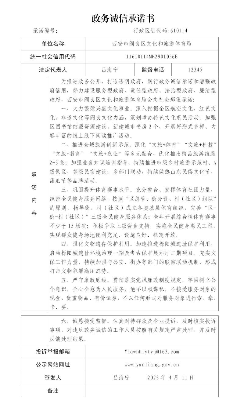 西安市閻良區(qū)文化和旅游體育局政務(wù)誠信承諾書