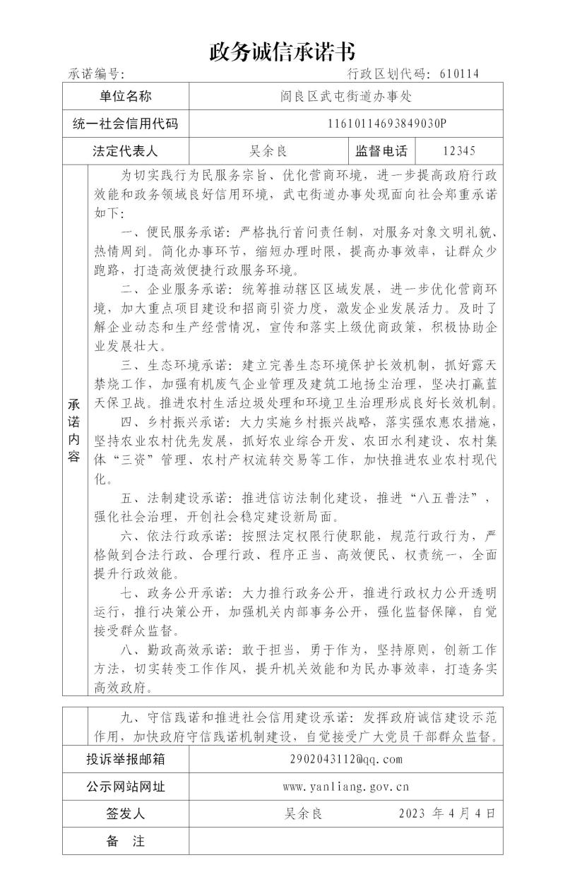 西安市閻良區武屯街道辦事處政務誠信承諾書
