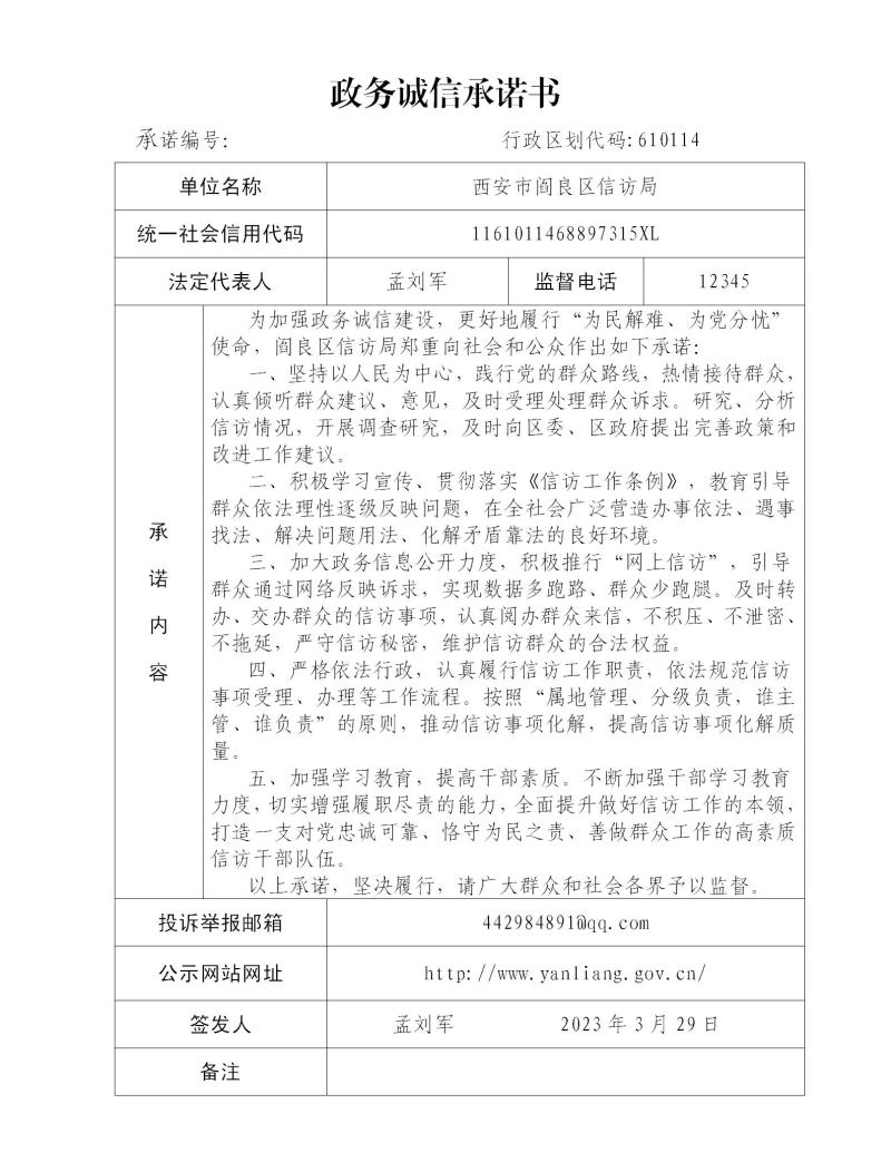 西安市閻良區(qū)信訪局政務(wù)誠(chéng)信承諾書(shū)