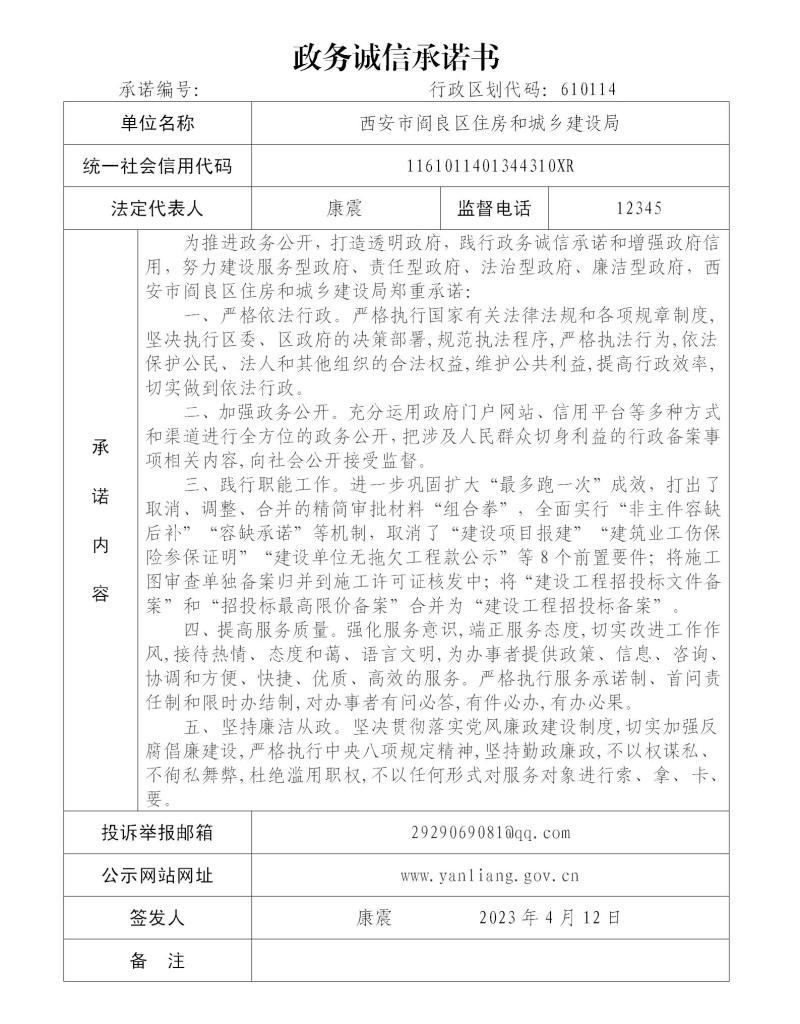西安市閻良區住房和城鄉建設局政務誠信承諾書