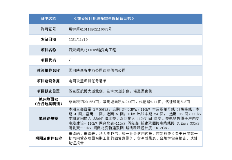 《建設項目用地預審與選址意見書》(用字第610114202110078號)