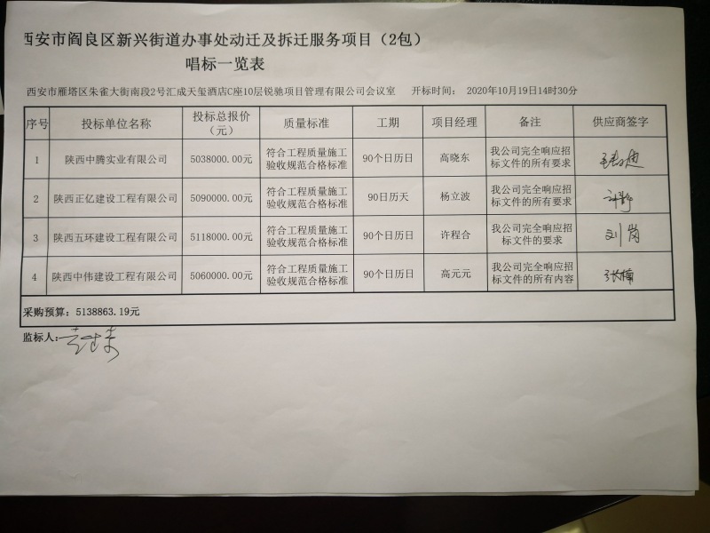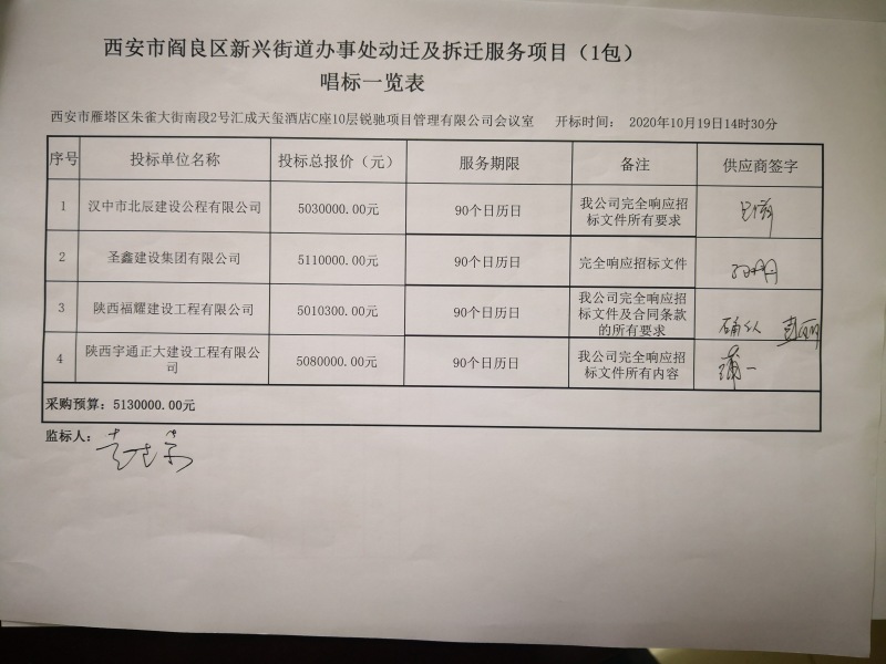 | 西安市閻良區新興街道辦事處動遷及拆遷服務項目 | 成茂奇、邱繼生、任聰林、楊蕊課、于蓉、張子建 | 代紅勝 |