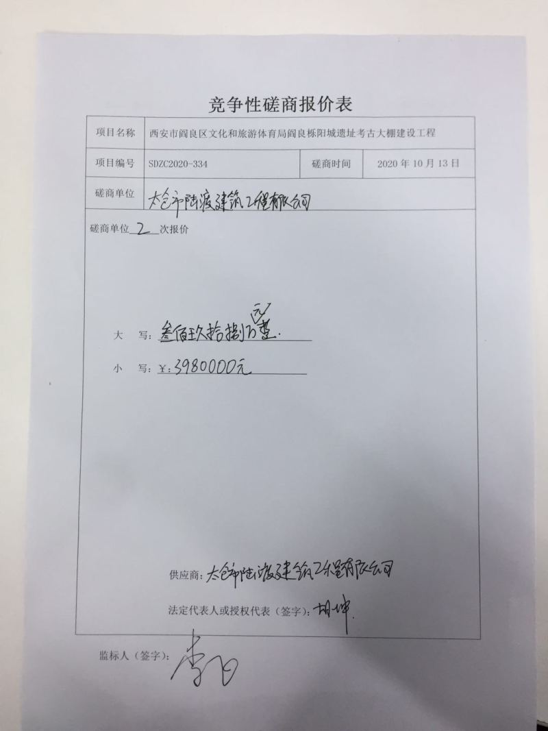 | 內容概述 | 關于西安市閻良區文化和旅游體育局閻良櫟陽城遺址考古大棚建設工程的采購結果公告一、項目編號:SDZC2020-334二、項目名稱:西安市閻良區文化和旅游體育局閻良櫟陽城遺址考古大棚建設工程三、采購結果:成交結果:成交供應商名稱:太倉市陸渡建筑工程有限公司供應商地址:太倉市陸渡鎮飛瀘路成交金額:中標3,980,000.00元四、主要成交標的信息334.jpg五、磋商小組名單:項目名稱專家采購人代表西安市閻良區文化和旅游體育局閻良櫟陽城遺址考古大棚建設工程劉玉蘭、王爭王小梅六、代理服務費收費標準及金額代理服務費收費標準:采購代理機構參照國家計委關于印發《招標代理服務收費管理暫行辦法》的通知(計價格〔2002〕1980號)、《國家發展和改革委員會辦公廳關于招標代理服務收費有關問題的通知》(發改辦價格〔2003〕857號)規定向中標(成交)供應商收取代理服務費。 | ||||