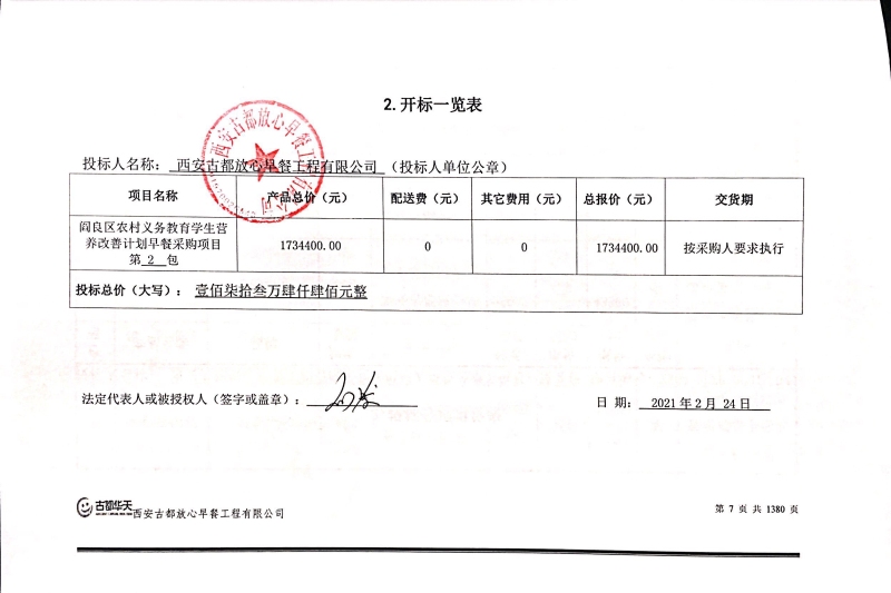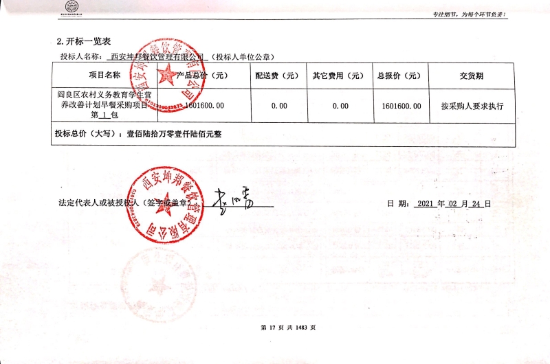 1、閻良區農村義務教育學生營養改善計劃早餐采購項目第1包: 21,617.00元