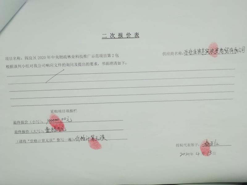 | 內(nèi)容概述 | 關于閻良區(qū)2020年中央財政林業(yè)科技推廣示范項目的采購結果公告一、項目編號:SXDC2021-ZB-17二、項目名稱:閻良區(qū)2020年中央財政林業(yè)科技推廣示范項目三、采購結果:1、第1包成交結果:成交供應商名稱:西安金農(nóng)豐實農(nóng)資商貿(mào)有限公司供應商地址:陜西省西安市閻良區(qū)鳳凰路街道辦斷塬村荊山路東段北側(cè)成交金額:734,000.00元2、第2包成交結果:成交供應商名稱:西安金農(nóng)豐實農(nóng)資商貿(mào)有限公司供應商地址:陜西省西安市閻良區(qū)鳳凰路街道辦斷塬村荊山路東段北側(cè)成交金額:100,000.00元四、主要成交標的信息1、第1包1包二次報價表.jpg2、第2包2包二次報價表.jpg五、談判小組名單:標項名稱專家采購人代表第1包劉清悅、嚴自斌王正春第2包劉清悅、嚴自斌王正春六、代理服務費收費標準及金額代理服務費收費標準:采購代理機構參照國家計委關于印發(fā)《招標代理服務收費管理暫行辦法》的通知(計價格〔2002〕1980號)、《國家發(fā)展和改革委員會辦公廳關于招標代理服務收費有關問題的通知》(發(fā)改辦價格〔2003〕857號)規(guī)定向中標(成交)供應商收取代理服務費。 | ||||