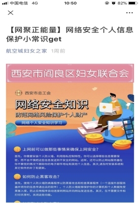 7、區婦聯于9月10日通過“航空城婦女之家”微信公眾號宣傳“網絡安全個人信息保護小常識”、“正確樹立婚姻觀”、“反詐小課堂”。