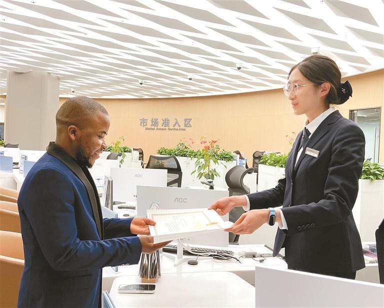 在西安市政務(wù)服務(wù)中心工作人員的幫助下,來(lái)自津巴布韋的Oriah Mudondo順利拿到營(yíng)業(yè)執(zhí)照。(資料圖片)